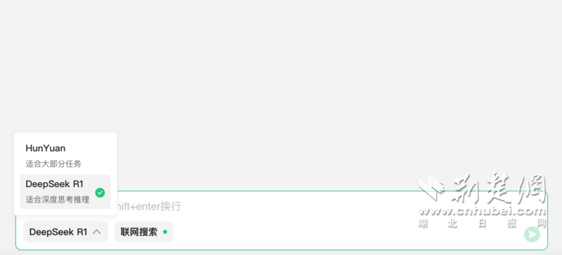 荊楚網(wǎng)(湖北日?qǐng)?bào)網(wǎng))訊(通訊員 袁軒)2月13日,騰訊AI助手“騰訊元寶”迎來重大更新,同時(shí)支持混元和DeepSeek兩大模型,打開騰訊元寶并進(jìn)入對(duì)話界面,即可免費(fèi)使用DeepSeek-R1滿血版模型。