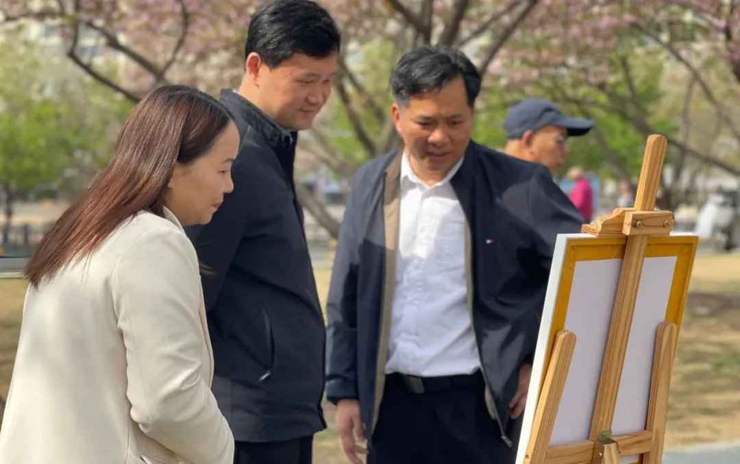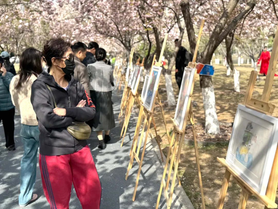 畫展布置于西北湖公園的櫻花大道上,眾多市民在櫻花樹下駐足欣賞。