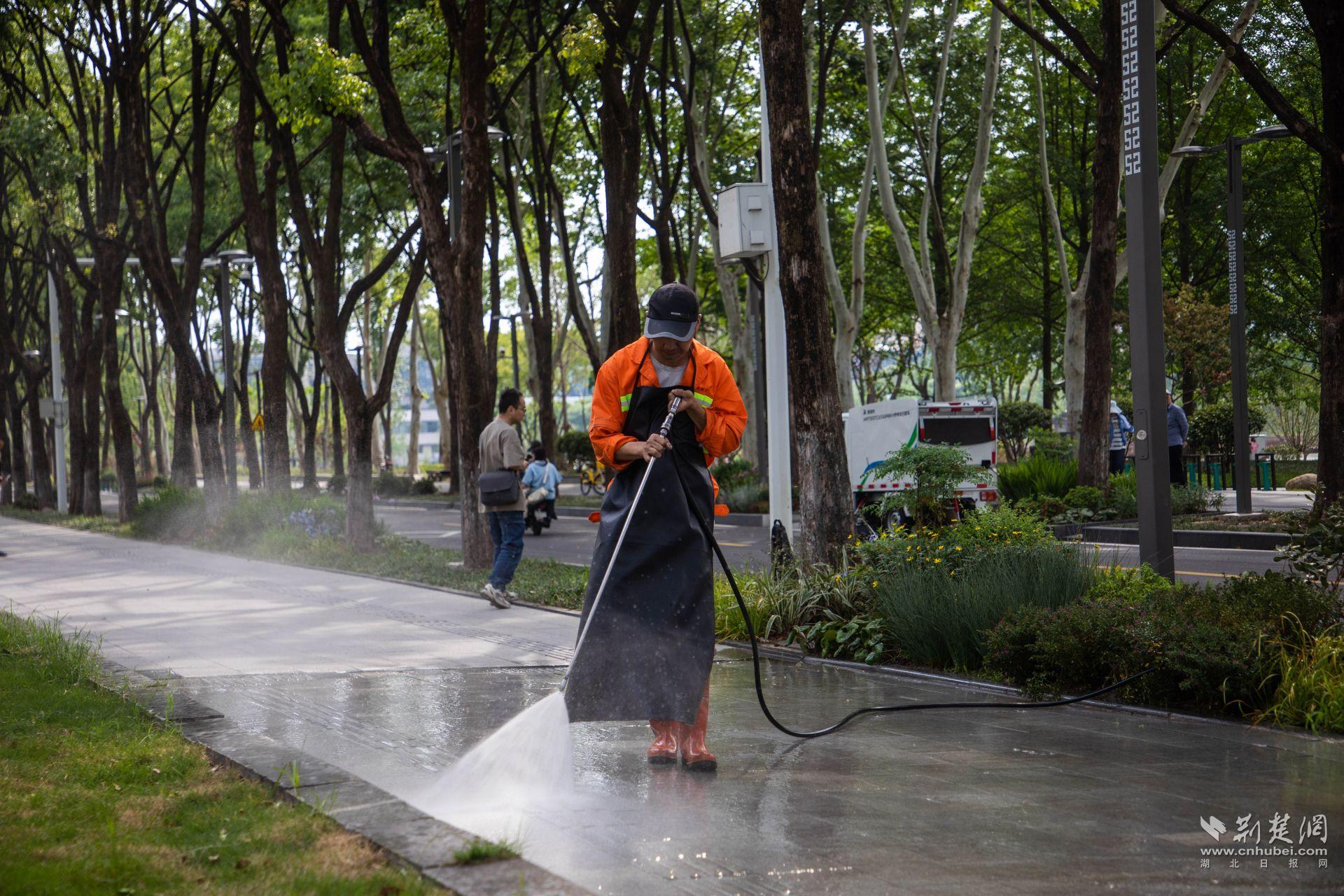 夜幕下的沿江大道,江岸環(huán)衛(wèi)黎黃陂路班組長(zhǎng)正在逐塊沖洗人行道地磚。班組長(zhǎng)占冬晴介紹說(shuō),“沿著漢口江灘,從山海關(guān)路到黎黃陂路再到江漢關(guān),都是最受年輕游客喜愛(ài)的地方,他們?cè)谶@里拍的每一張打卡照,都是展示城市文明的窗口,我們不能有半點(diǎn)馬虎。”