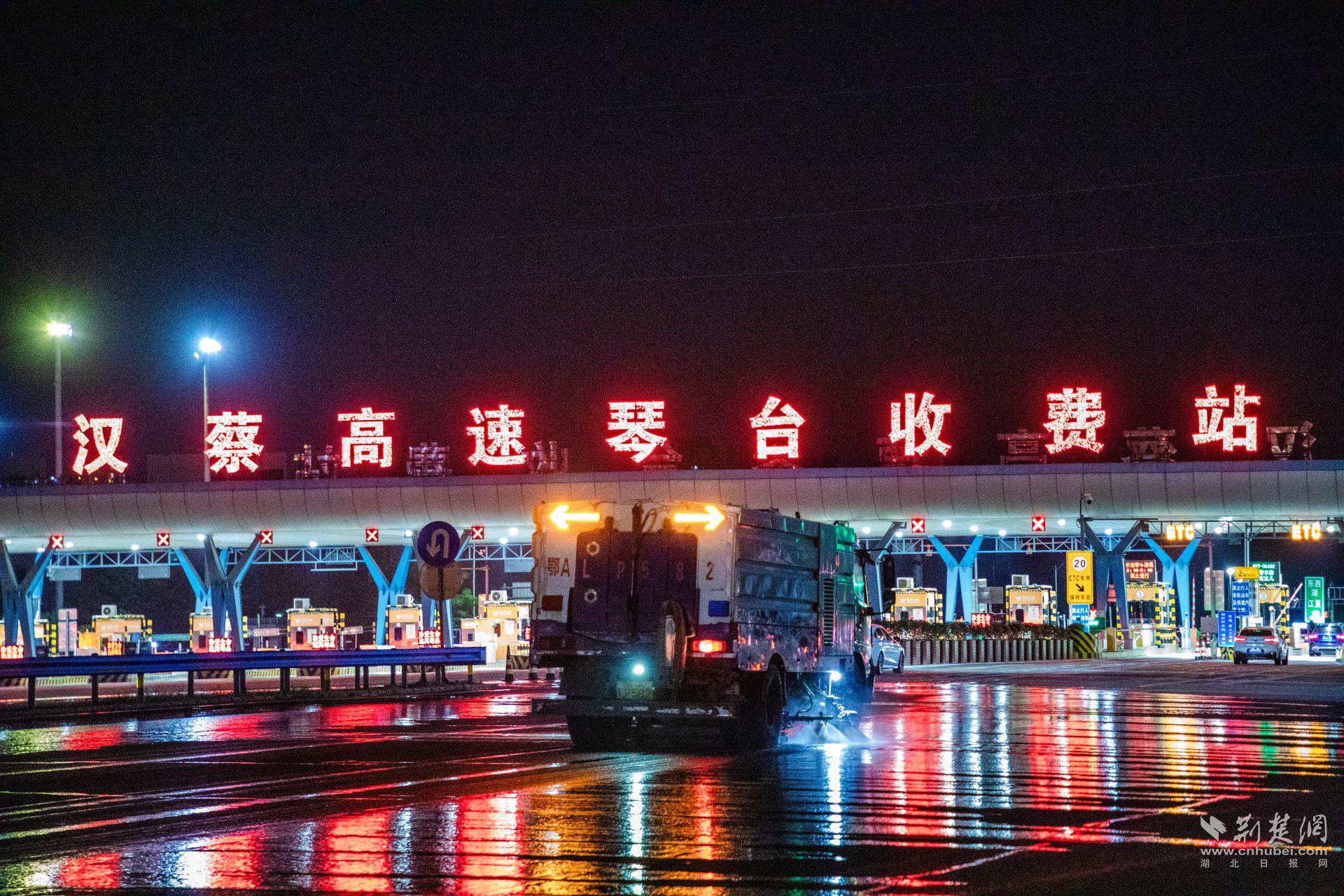 29日夜晚11時(shí)許,在漢陽(yáng)漢蔡高速進(jìn)出城口,高壓清洗車(chē)、吸掃車(chē)、隔音屏清洗車(chē)等10余臺(tái)機(jī)械作業(yè)裝備待發(fā)。