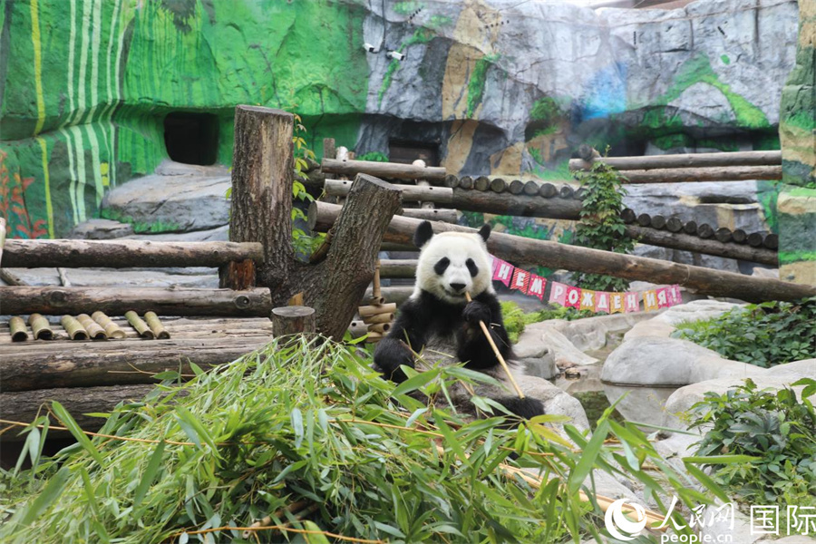 | “喀秋莎”在生日慶祝活動上享用竹子。 人民網(wǎng)記者 肖新新攝 |