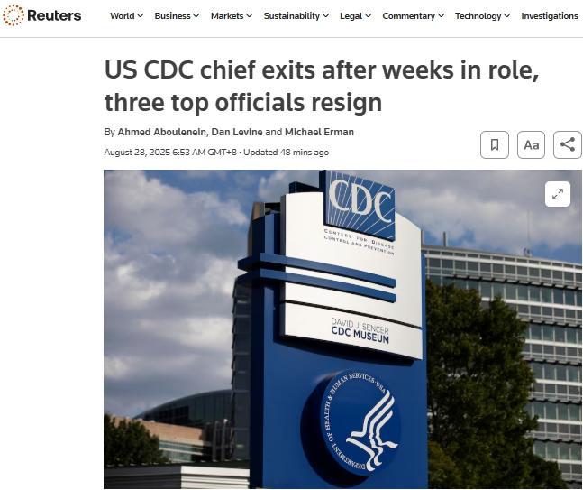 據(jù)報道,美國疾控中心醫(yī)療官員黛布拉·霍里、免疫與呼吸道疾病中心主任德米特·達斯卡拉基斯、美國國家新發(fā)與人畜共患傳染病中心主任丹·杰尼根均已辭去職務。
