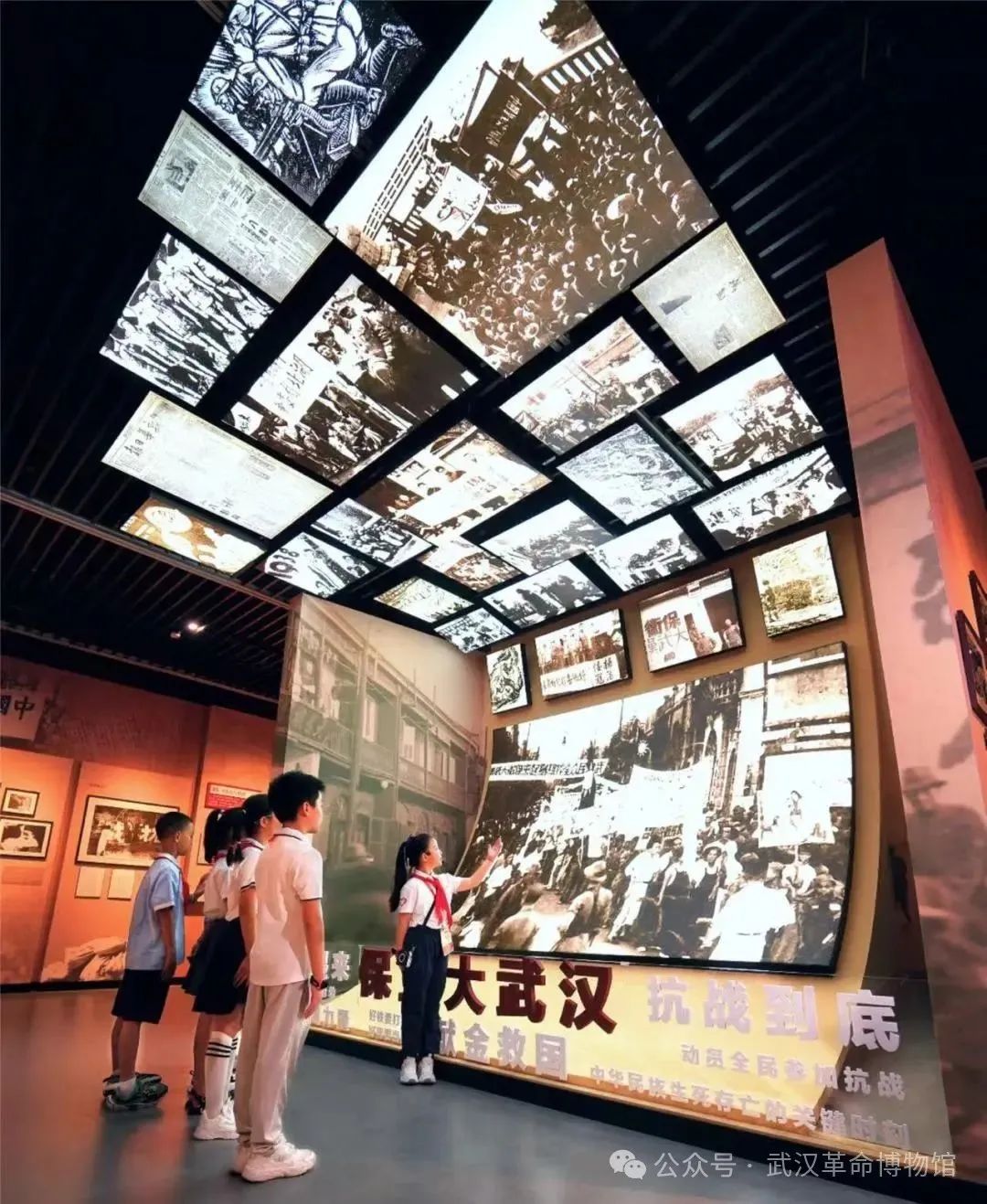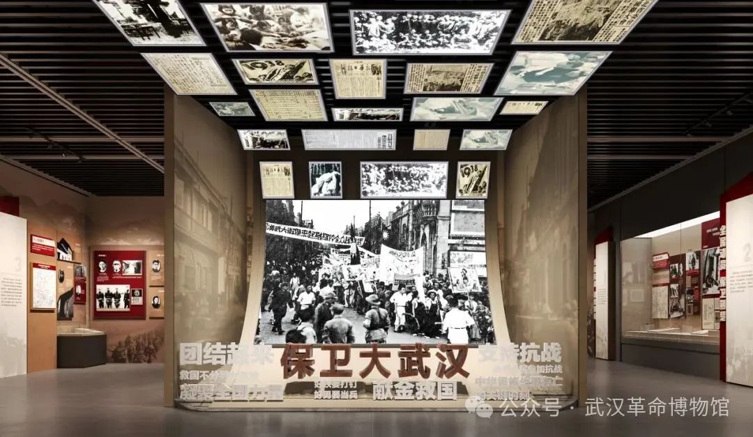 “保衛(wèi)大武漢”場(chǎng)景采用音頻+燈箱照片結(jié)合的方式,展示中國共產(chǎn)黨領(lǐng)導(dǎo)下的“以抗日救亡團(tuán)體為骨干,救亡書刊為導(dǎo)向,救亡活動(dòng)為內(nèi)容”三位一體的抗日救亡活動(dòng),以武漢為中心,迅速席卷全國。