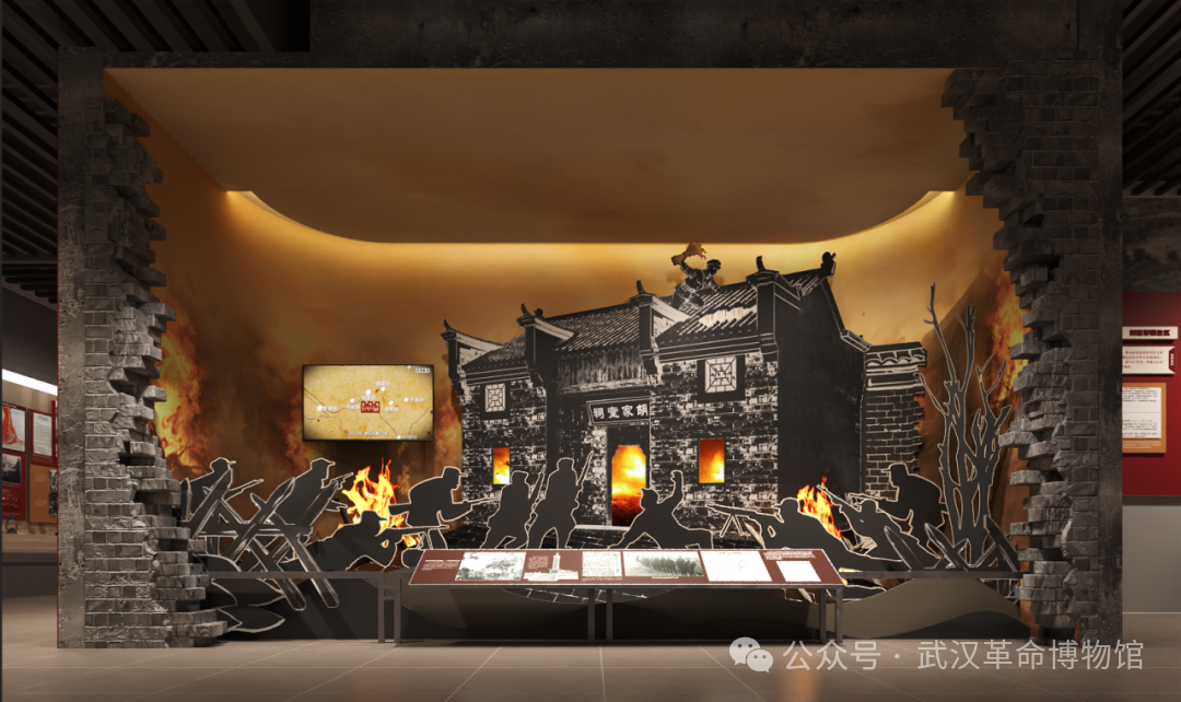 “火燒胡家祠堂”采用藝術(shù)場(chǎng)景+視頻結(jié)合的方式,定格侏儒山戰(zhàn)役中的胡家臺(tái)戰(zhàn)斗,生動(dòng)刻畫出百姓毀家紓難與新四軍第五師并肩作戰(zhàn)的英勇精神,使觀眾身臨其境地感受到勝利來之不易。