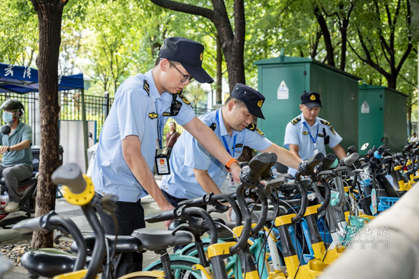 綜合執(zhí)法中心工作人員清理校園周邊共享單車。 通訊員供圖
