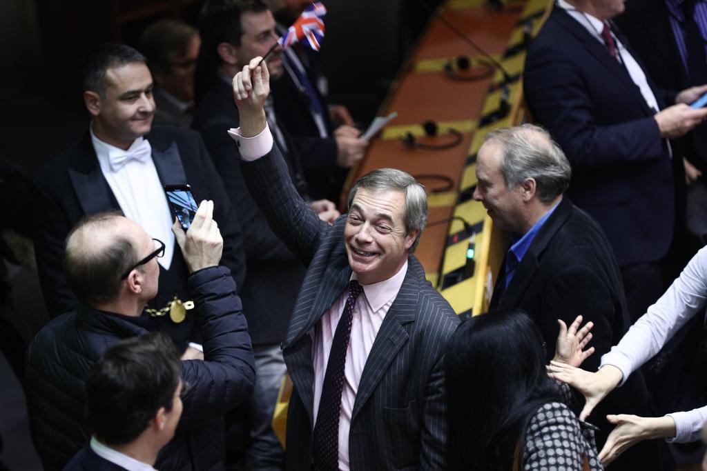 2020年1月29日,在比利時布魯塞爾,英國“脫歐黨”領袖、歐洲議會議員奈杰爾·法拉奇在英國“脫歐”協(xié)議投票結(jié)果公布后慶祝。新華社記者鄭煥松攝