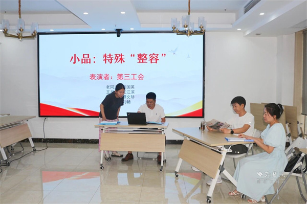 才藝展示團隊賽環(huán)節(jié),《心靈美容院》《“照鏡子 正衣冠”研討會》《特殊整容》等精彩節(jié)目輪番上演。黨群干部通過小品、朗誦、合唱等多元形式,生動呈現(xiàn)在思想引導、作風建設(shè)和團隊凝聚中的實踐與思考,剖析了工作中的“痛點”“堵點”,映射出黨群工作者直面問題的工作實效。