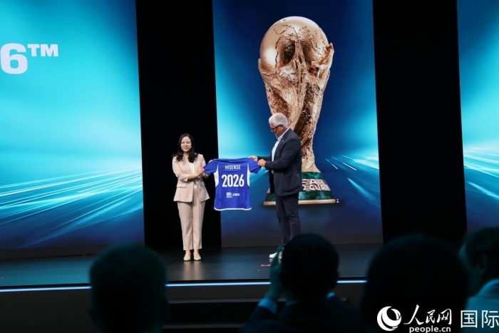 圖為國(guó)際足聯(lián)首席商務(wù)官羅米·蓋伊向海信代表贈(zèng)送2026世界杯紀(jì)念品。人民網(wǎng)記者 劉仲華攝