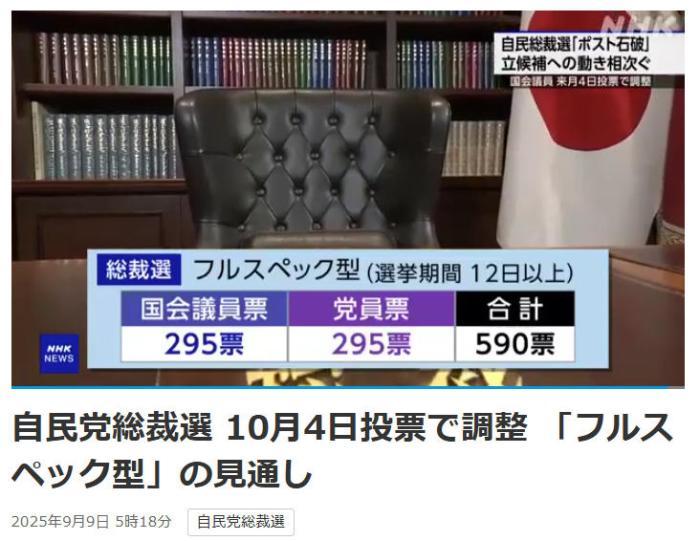 報道稱,自民黨將于9月9日敲定總裁選舉的日程和形式,預計9月22日發(fā)布公告,10月4日進行自民黨籍國會議員投票。