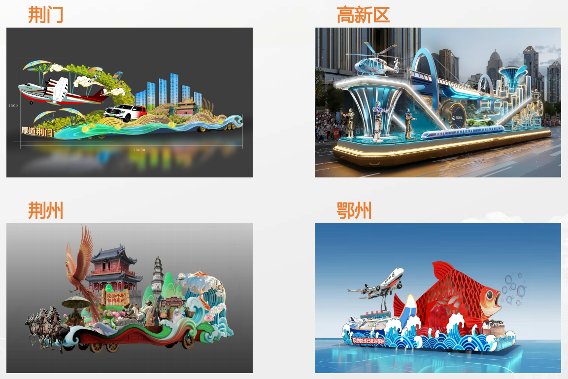 3、“楚風(fēng)漢韻”花車:《鳳舞楚天》、《問道武當(dāng)》、《神農(nóng)架梆鼓》、知音號(hào)、《西蘭卡普》;
