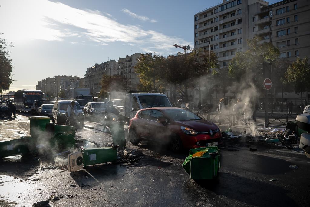 9月10日,在法國(guó)巴黎街頭,示威者用垃圾桶封鎖道路。新華社發(fā)(奧雷利安·莫里薩爾攝)