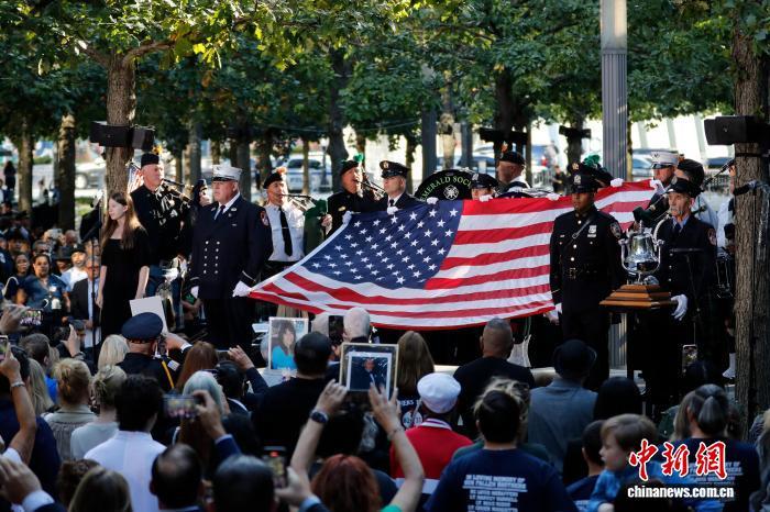 當天上午8點40分許,由紐約市警察、消防員等組成的儀仗隊高舉美國國旗走上講臺,一名17歲高中生唱響美國國歌,紀念儀式正式開始。8點46分,悼念的鐘聲響起,全場默哀。隨后,遇難者親屬代表登臺,依次念出所有遇難者姓名。