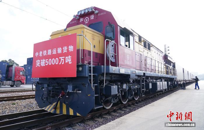 2025年1月2日,一列滿載新鮮果蔬的中老鐵路國際貨物列車從中國云南昆明啟程駛向老撾,標(biāo)志著自2021年12月3日全線開通運(yùn)營以來,中老鐵路貨物運(yùn)輸總量突破5000萬噸?!≈行律缬浾?劉冉陽 攝