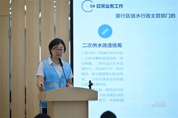 活動(dòng)開(kāi)場(chǎng),武昌區(qū)水資源管理服務(wù)中心主任周妍圍繞《武昌區(qū)水務(wù)和湖泊局及水資源管理中心工作職責(zé)》展開(kāi)解讀,清晰梳理水務(wù)部門(mén)在水資源調(diào)配、供水保障、設(shè)施維護(hù)等方面的職能;同時(shí)深入講解二次供水改造及修繕現(xiàn)行政策,從改造標(biāo)準(zhǔn)、申請(qǐng)流程到惠民福利逐一剖析,讓居民明晰這項(xiàng)民生舉措。
