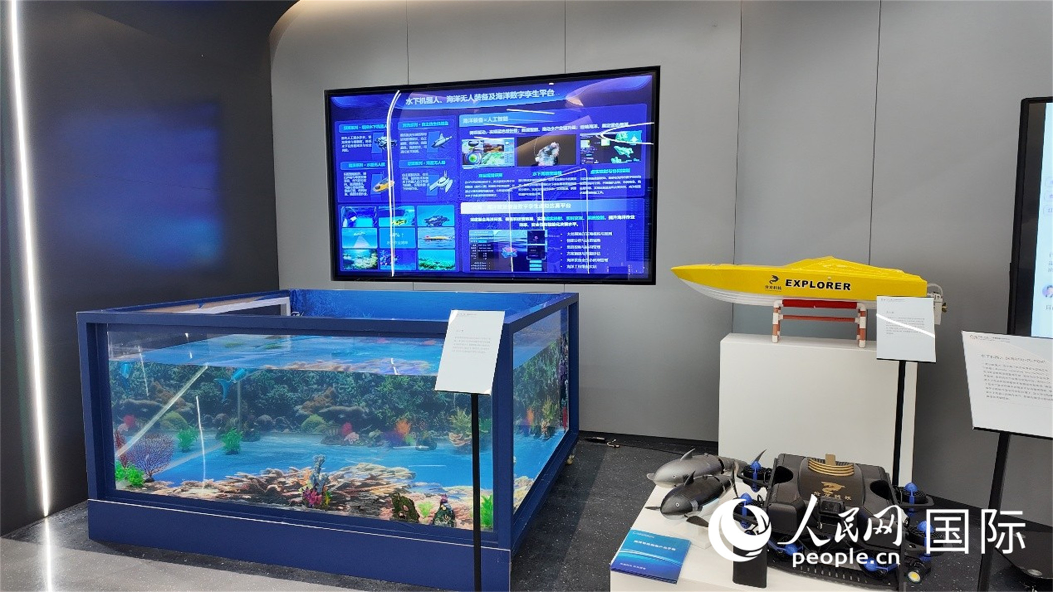 水下機(jī)器人、海洋無(wú)人裝備及海洋數(shù)字孿生平臺(tái)。人民網(wǎng) 張醴泉攝