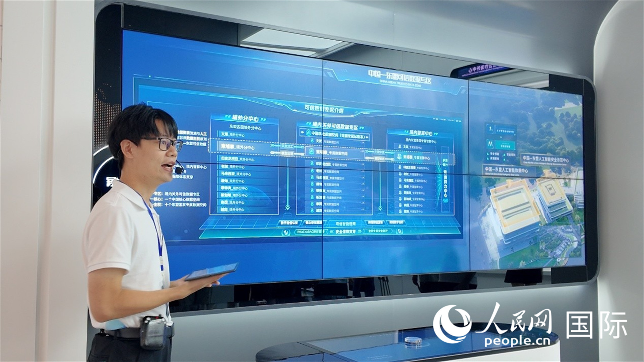 講解員正在為參觀嘉賓講解中心重點(diǎn)展示項(xiàng)目——中國(guó)—東盟可信數(shù)據(jù)專區(qū)。人民網(wǎng) 張醴泉攝