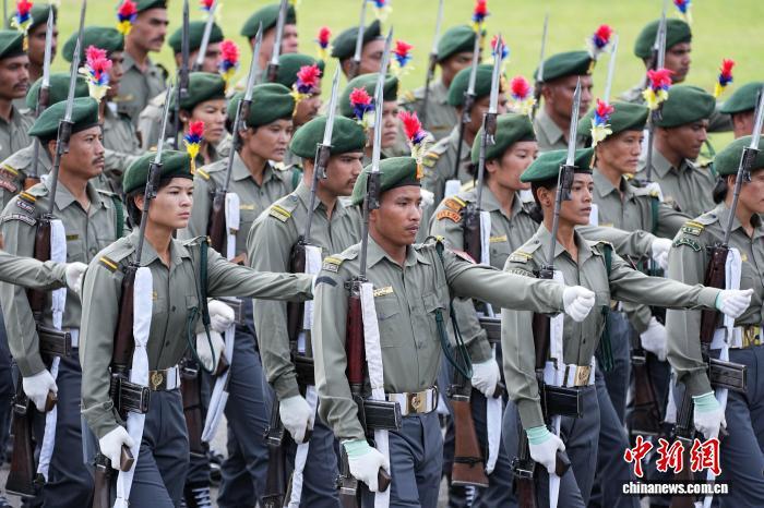 9月19日,尼泊爾臨時(shí)政府舉行憲法日暨國慶日慶祝活動(dòng),紀(jì)念尼泊爾現(xiàn)行憲法頒布施行十周年。圖為尼泊爾武警部隊(duì)接受檢閱。中新社記者 崔楠 攝