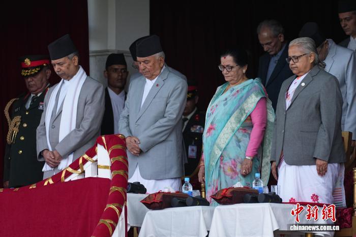 9月19日,尼泊爾臨時(shí)政府舉行憲法日暨國慶日慶?;顒?dòng),尼泊爾總統(tǒng)鮑德爾(中)、臨時(shí)政府總理卡爾基(右一)等在活動(dòng)開始前為近期示威游行死難者默哀。中新社記者 崔楠 攝