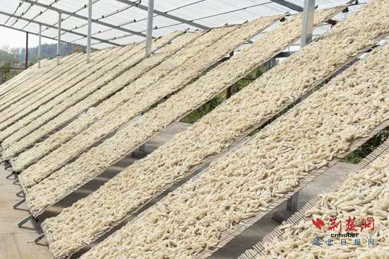 而這樣的環(huán)境催生了“豆絲”這一鄂州傳統(tǒng)美食。除了大米外,綠豆、黃豆、葛根等“豆絲”原材料生長在山溝、溪邊、林中?!懊磕耆攵瑤缀跫壹移鸫笤铋_始制作豆絲,風(fēng)干后可以留存整個(gè)冬天。”周楊介紹。