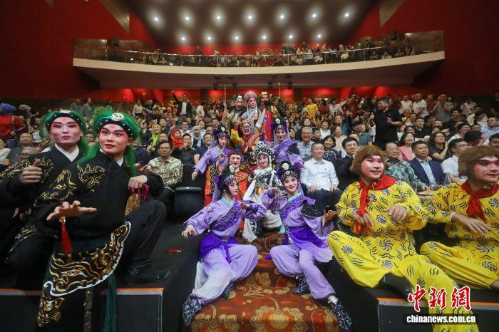 9月23日晚,浙江婺劇團(tuán)雅加達(dá)專場上演。圖為謝幕后,眾演員與觀眾合影。中新社記者 李志全 攝
