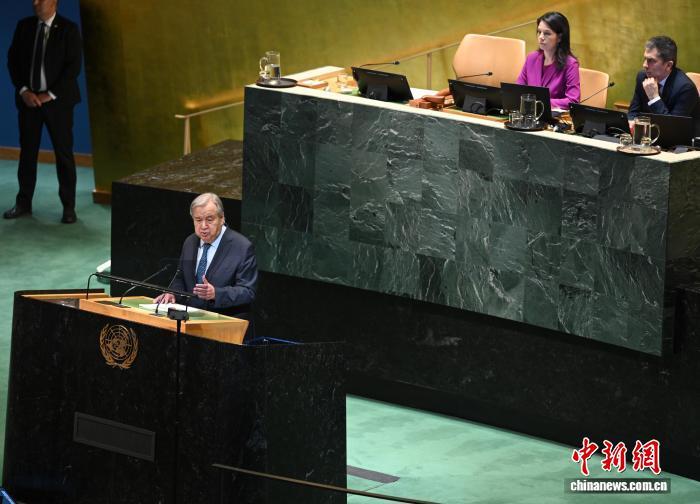 當(dāng)?shù)貢r(shí)間9月23日,紐約聯(lián)合國(guó)總部,第80屆聯(lián)合國(guó)大會(huì)一般性辯論開(kāi)幕。圖為聯(lián)合國(guó)秘書(shū)長(zhǎng)古特雷斯在開(kāi)幕式上致辭。 中新社記者 陳孟統(tǒng) 攝
