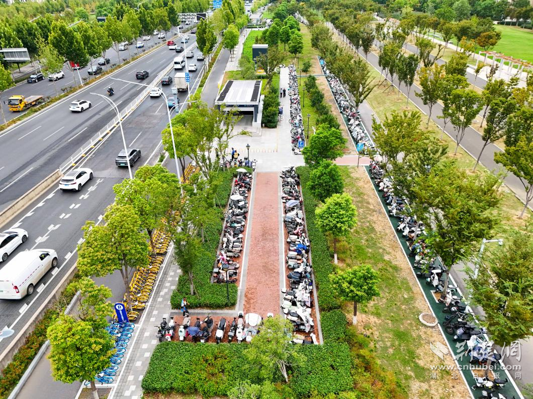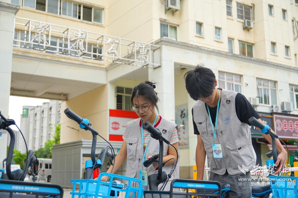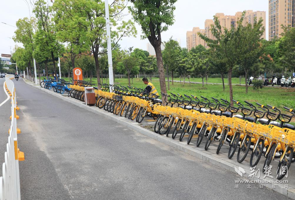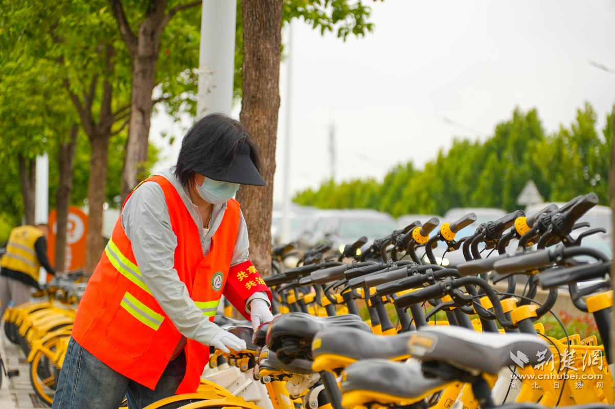 而在不遠處的五環(huán)體育中心站,環(huán)衛(wèi)工李師傅掃完地,順手把一輛歪倒的美團單車扶正,輕輕推進黃色線框內;幾公里外的常青花園,武漢輕工大學的學生袁丁正帶著幾個學弟學妹,把幾輛“串門”到電動車區(qū)域的共享單車一一“請”回指定區(qū)域……這些看似尋常的畫面,正是武漢市東西湖區(qū)破解非機動車停車亂象的“治理密碼”。
