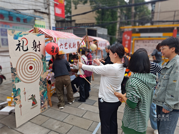 游戲互動(dòng)區(qū)氛圍熱烈?!吧涓膊轮i”攤位前,居民踴躍參與,猜中謎底者可獲贈(zèng)汪玉霞蘇月餅;“投壺納?!蔽娙艘辉嚿硎?,在趣味中感受古禮韻味;“福來套圈”則準(zhǔn)備了洗衣液、透明皂等實(shí)用獎(jiǎng)品,深受居民喜愛。此外,“六藝禮射”項(xiàng)目讓居民親身體驗(yàn)傳統(tǒng)射藝,在拉弓搭箭間感受古人的尚武精神與禮儀風(fēng)范。