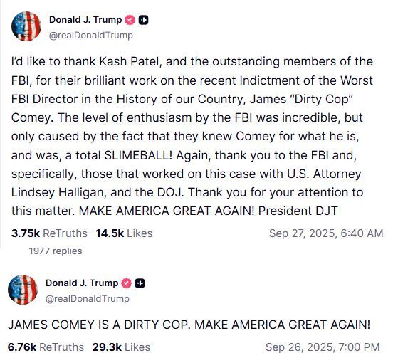 過(guò)了短短幾分鐘,特朗普再發(fā)一篇短帖文:“科米是個(gè)骯臟警察。讓美國(guó)再次偉大!”