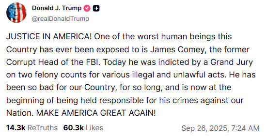 科米被起訴消息公布后,特朗普立即在社交媒體上表示“慶?!?,稱科米“長(zhǎng)期以來(lái)對(duì)美國(guó)非常壞”,現(xiàn)在“正義終于得到伸張”。就在數(shù)天前,特朗普還在社交媒體上發(fā)帖,抱怨司法部對(duì)科米的調(diào)查遲遲沒(méi)有下文,要求盡快對(duì)科米提起訴訟。