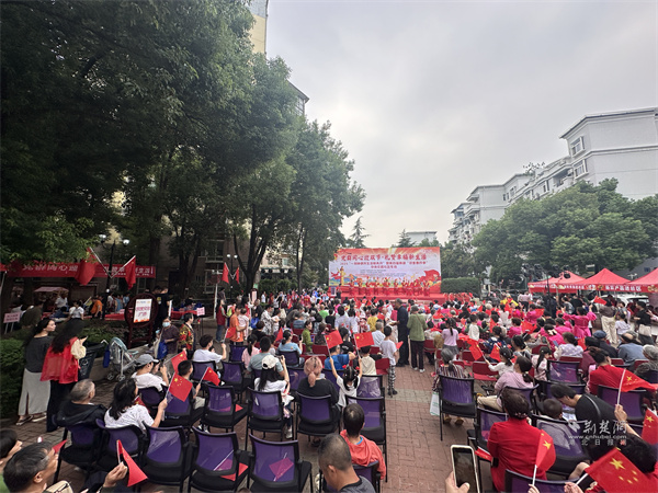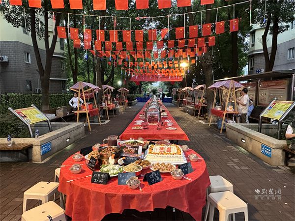 活動中,文藝表演與互動環(huán)節(jié)穿插進行,帥鼓《歌唱祖國》、民樂《地道戰(zhàn)》、黃梅戲《再唱山歌給黨聽》輪番上演。當(dāng)54平方米的巨幅國旗緩緩展開,居民們揮舞小國旗齊唱贊歌,手中的紙飛機帶著美好祝愿飛向夜空,電子煙花綻放的瞬間,現(xiàn)場氣氛達到高潮。此外,三輪抽獎、“最受歡迎菜品”評選等環(huán)節(jié),更讓活動充滿驚喜與趣味。