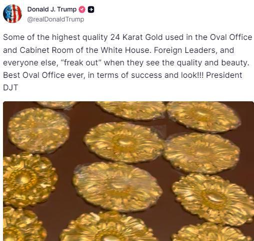 特朗普寫道,“白宮橢圓形辦公室和內(nèi)閣會議室使用了品質(zhì)最高的24K黃金。外國領(lǐng)導人以及其他人在看到其品質(zhì)與精美程度后都‘驚嘆不已’”。