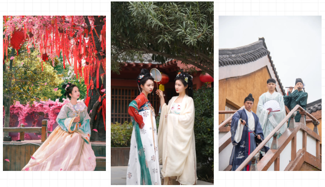 首先,清明上河園是宋式園區(qū),和古裝超級適配!所以,可以著漢服入園,另外,園區(qū)設(shè)有三處免費換裝點,分別位于迎賓門廣場、宋裝館、尚服局,都可以免費換裝,團扇、折扇也可以備一把哦~