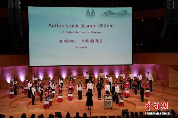 當(dāng)?shù)貢r(shí)間10月4日,中德青少年交流音樂(lè)會(huì)暨“唱歌學(xué)中文”夏令營(yíng)匯報(bào)演出在德國(guó)埃森舉行。圖為中德青少年合唱開(kāi)場(chǎng)曲《茉莉花》?!≈行律缬浾?馬秀秀 攝
