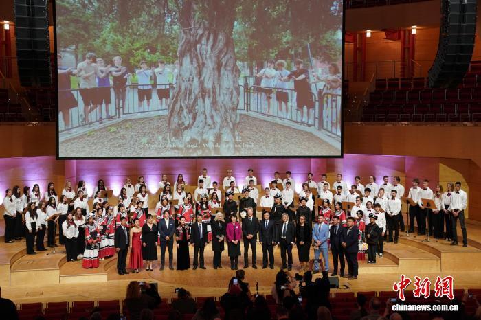 當(dāng)?shù)貢r(shí)間10月4日,中德青少年交流音樂(lè)會(huì)暨“唱歌學(xué)中文”夏令營(yíng)匯報(bào)演出在德國(guó)埃森舉行。圖為嘉賓與中德青少年等合影?!≈行律缬浾?馬秀秀 攝