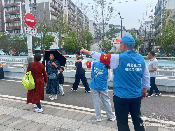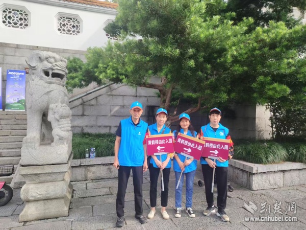 西廠口社區(qū)“市民園長”志愿團隊在黃鶴樓景區(qū)開展文明引導(dǎo)與旅游咨詢。 通訊員供圖