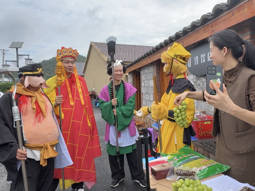 為了增添活動(dòng)的趣味性和傳播力,鎮(zhèn)黨委、政府特別安排了志愿者扮演唐僧師徒四人,作為推薦官在直播間為大家推薦各類好物,吸引了不少粉絲進(jìn)到直播間。隨后,還沿著林澗小隱、魚鱗壩巡展,與村民互動(dòng),不僅為展銷會(huì)增添了歡聲笑語,也讓鄉(xiāng)村振興的理念以更生動(dòng)的方式深入人心。