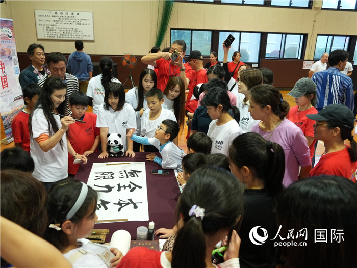 中國(guó)書(shū)法展示引來(lái)眾人圍觀(guān)。人民網(wǎng) 許可攝