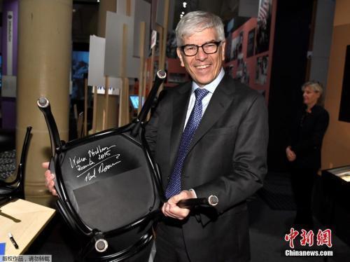 資料圖:2018年諾貝爾經(jīng)濟(jì)學(xué)獎(jiǎng)獲得者保羅·羅默展示其簽名的椅子。