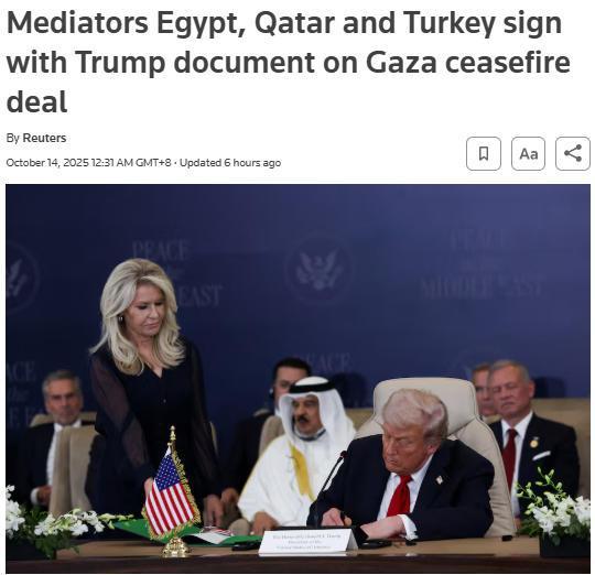 中新網(wǎng)10月14日電 據(jù)路透社報(bào)道,當(dāng)?shù)貢r(shí)間13日,美國(guó)總統(tǒng)特朗普在埃及沙姆沙伊赫,與埃及、卡塔爾和土耳其三國(guó)領(lǐng)導(dǎo)人共同簽署了關(guān)于加沙停火協(xié)議的文件。