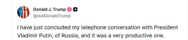 △美總統(tǒng)特朗普16日在與普京結(jié)束通話后,在其個人社交媒體平臺上發(fā)布的部分聲明截圖。