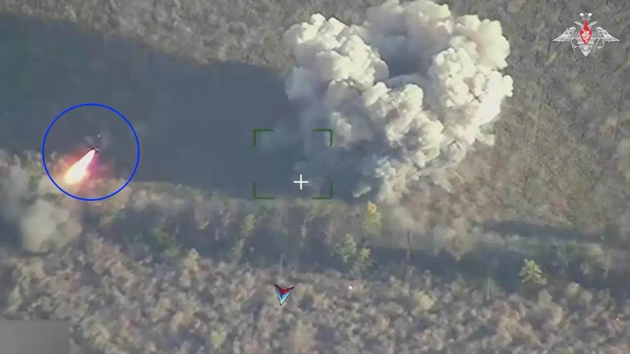 俄軍攔截Neptun-d成功,右側(cè)塵埃云為俄“伊斯-M”導(dǎo)彈爆炸產(chǎn)生,左藍(lán)圈為Neptun-d火箭發(fā)動機(jī)被彈片擊中