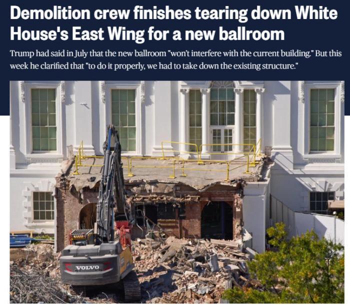 特朗普曾在7月表示,這個宴會廳“不會影響現(xiàn)有建筑”,但他10月22日表示,在“與全球頂尖建筑師進行了大量研究”后,決定“最好從頭開始”。
