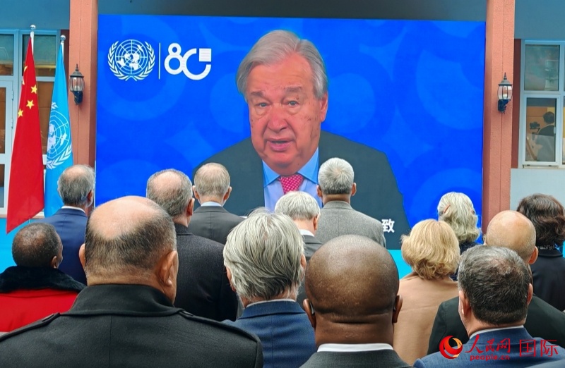 聯(lián)合國(guó)秘書長(zhǎng)古特雷斯發(fā)來(lái)聯(lián)合國(guó)日致辭視頻。人民網(wǎng)記者 李琰攝