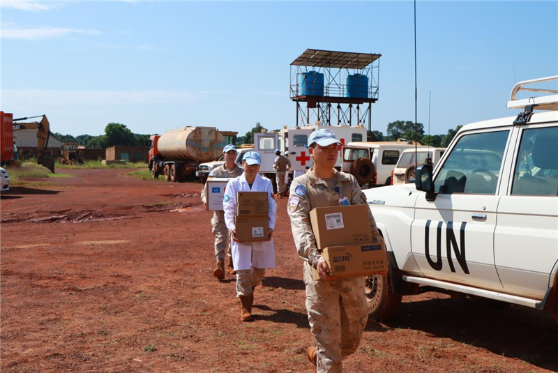 中國維和醫(yī)療分隊(duì)向當(dāng)?shù)鼐栀涐t(yī)療物資。魯振輝攝