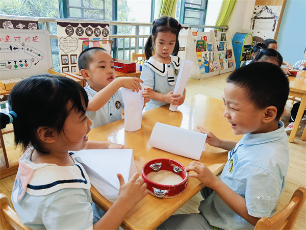 動(dòng)手環(huán)節(jié)點(diǎn)燃孩子們的熱情,四人一組的小隊(duì)伍里,小朋友們手握A4紙、膠帶躍躍欲試,有的反復(fù)卷緊紙張,力求讓紙筒更厚實(shí);有的湊著腦袋和伙伴商量,給紙筒底部貼“小支架”增強(qiáng)穩(wěn)定性。課堂里,剪刀裁剪聲、膠帶粘貼聲伴著小聲討論,專注的小身影構(gòu)成了熱鬧又溫馨的畫面。