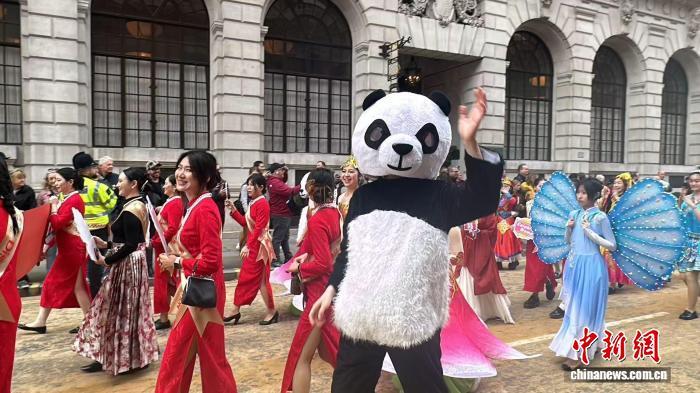 隊(duì)伍最前列由六位身著旗袍的禮儀女士領(lǐng)銜、她們或手持中國(guó)書(shū)畫(huà)卷軸、或佩戴印有“好美諸暨”“英國(guó)浙江會(huì)”字樣的綬帶與珍珠飾品。她們身后登場(chǎng)的,是充滿(mǎn)童趣與文化象征意義的第二方陣——兩只憨態(tài)可掬的大熊貓、兩顆孕育珍珠的貝殼,以及三朵亭亭玉立的荷花。