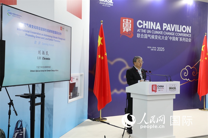 當(dāng)?shù)貢r間11月12日下午,中國氣候變化事務(wù)特使劉振民在中國角“應(yīng)對氣候變化和促進(jìn)綠色低碳轉(zhuǎn)型國際合作”主題邊會致辭。人民網(wǎng)記者 陳一鳴攝