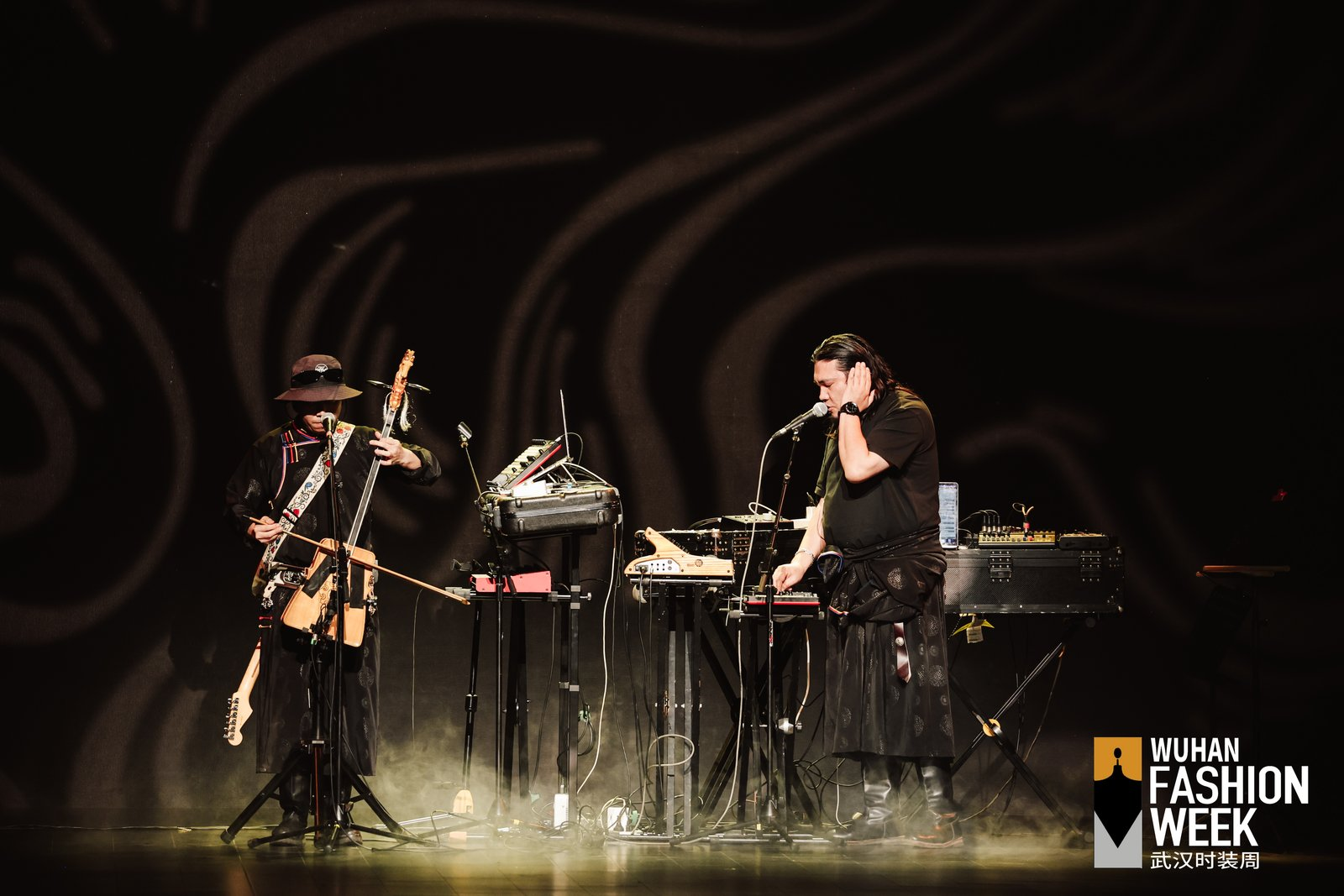 陳宇攜手Taiga樂隊,把錫林郭勒草原的晨霧、馬頭琴與電子節(jié)拍轉(zhuǎn)化成可行走的時裝音景??沙掷m(xù)植物素皮、流蘇與繩結形成呼應,讓游牧精神在當代廓形中保持自由。