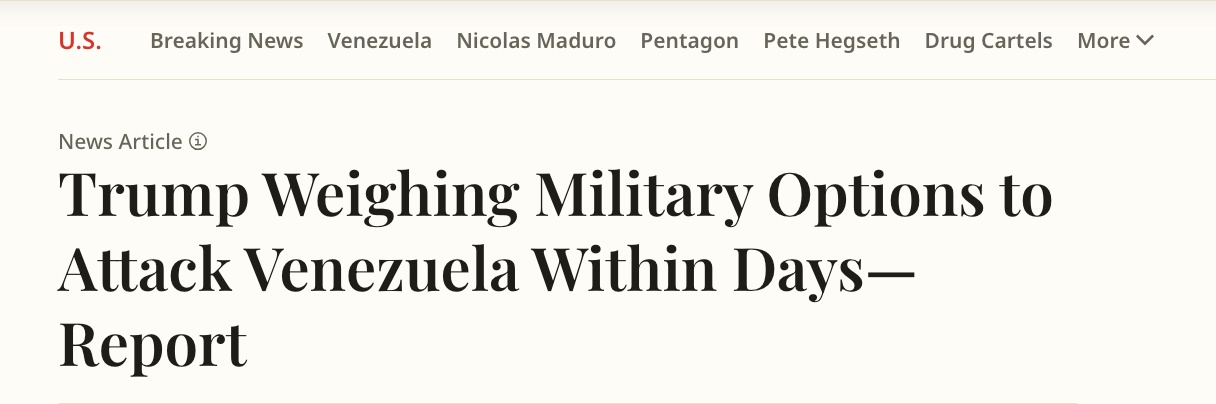 △美國《新聞周刊》報(bào)道,特朗普正在權(quán)衡于數(shù)日內(nèi)對(duì)委內(nèi)瑞拉發(fā)起軍事打擊。