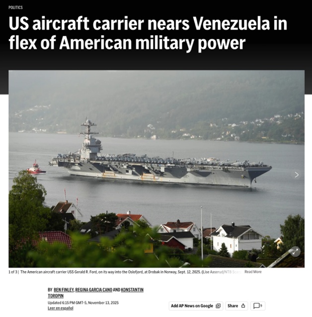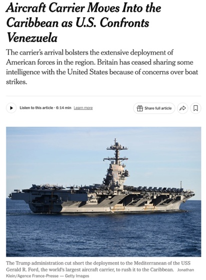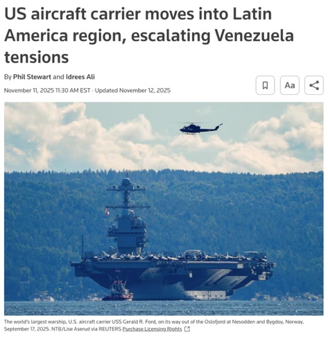 △美聯(lián)社報(bào)道,“福特”號(hào)航母將在數(shù)日內(nèi)抵達(dá)委內(nèi)瑞拉近海,美國的這種軍事力量展示,在拉美已有數(shù)代人未曾見過。